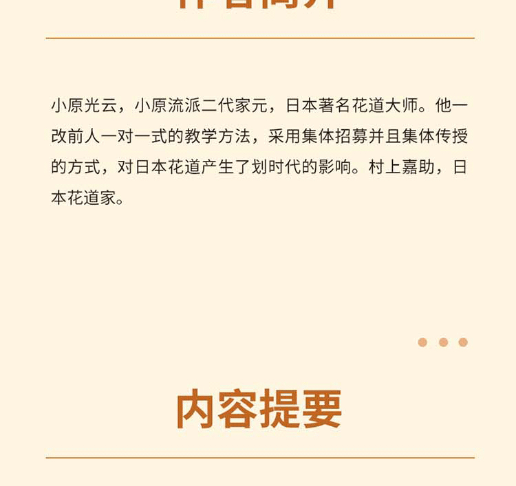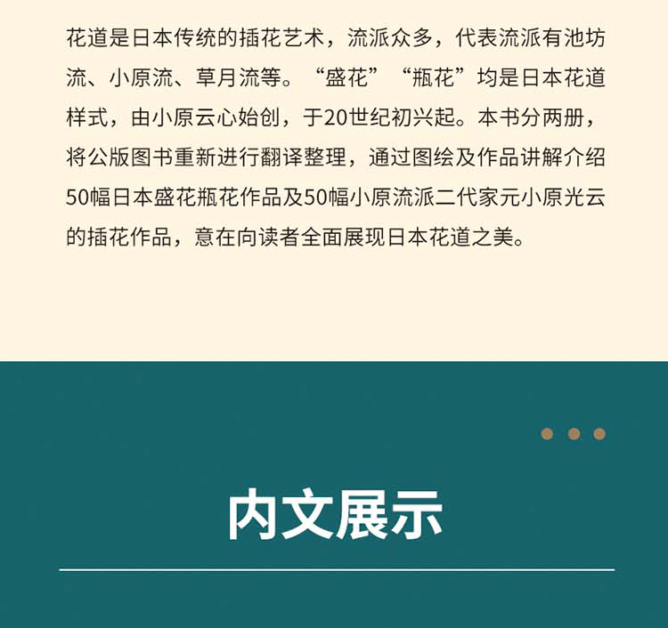 花道是日本傳統的插花藝術,流派眾多,代表流派有池坊流、小原流、草月流等。 “盛花”“瓶花”均是日本花道樣式,由小原雲心始創,於20世紀初興起。本書分兩冊,將公版圖書重新進行翻譯整理,通過圖繪及作品講解介紹50幅日本盛花瓶花作品及50幅小原流派二代家元小原光雲的插花作品,意在向讀者全面展現日本花道之美。