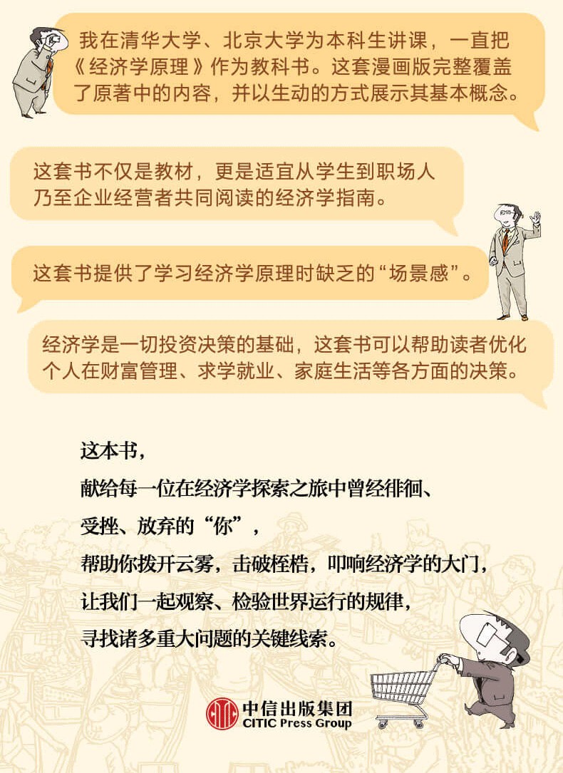 作為原版教材中文版一版到第八版的譯者,應該說我對曼昆的原版教材相當熟悉,但在讀“漫畫版”時仍然感到有新意。這種新意不僅在於漫畫形式之新,還在於簡練又精確的內容之新,更在於作者許多有新意的發展與擴充。所以,我想這套書對沒讀過原版教材或因原版教材太厚、不好讀而畏難的朋友來說,是佳的入門書。想找到比這更容易的入門書,恐怕很難了。對於已讀過原版教材,甚至以經濟學為專業的朋友來說,這套書同樣值得一看,它會帶給你很多新知識、新視角和新樂趣。再讀“漫畫版”,你又會重溫幼年時讀連環畫的情景。
