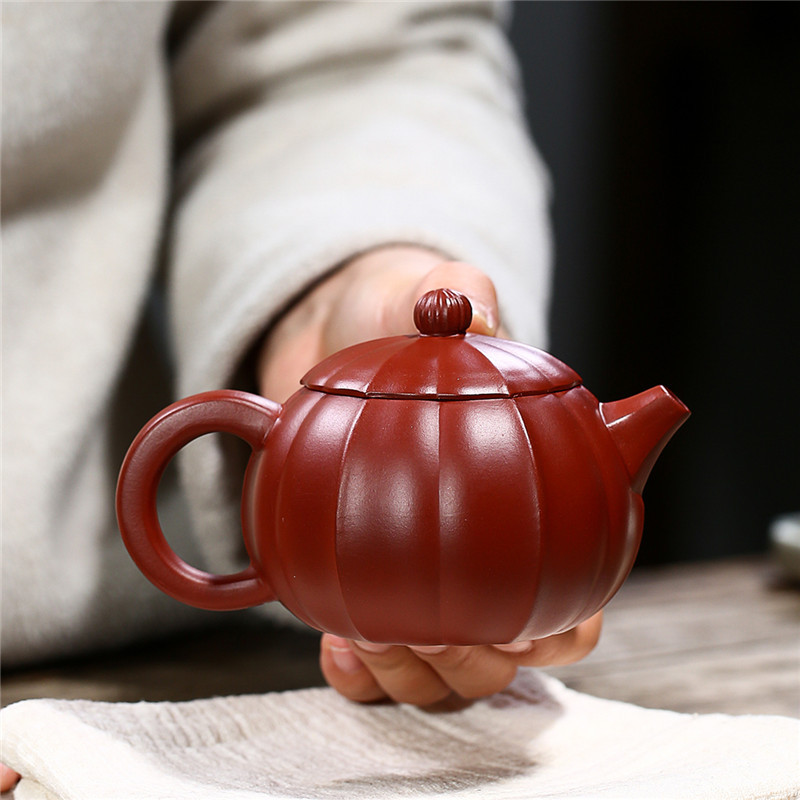 大紅袍南瓜瓣壺原礦紫砂仿古筋紋合菱壺