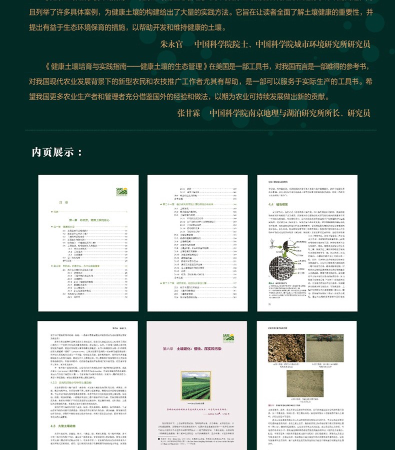 《健康土壤培育與實踐指南—健康土壤的生態管理》不僅對土壤健康的各種構建方法進行了詳細的闡述,而且列舉了許多具體案例,為土壤健康的構建給出了大量的實踐方法。本書旨在讓讀者全面了解土壤健康的重要性,並提出有益於生態環境保育的措施,以幫助維護和培育健康的土壤。值得一提的是,本書並不是簡單地針對某種問題給出具體化的普適性建議,而是教導人們如何通過分析土壤狀態、全面掌握和了解土壤的有關信息,然後根據土壤特性和相關管理措施的優缺點,結合當地的實際情況,讓讀者透過自己的思考與探索來得出一個最佳答案。