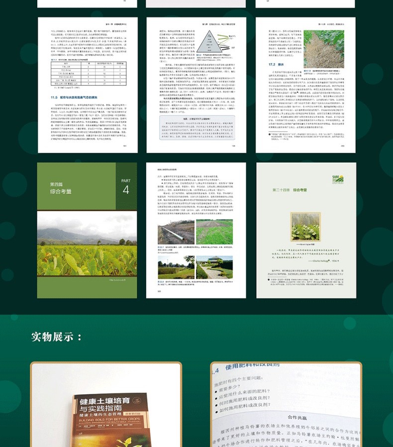 世界各地的土壤狀況紛繁多樣,由於氣候、環境、地形和人文因素的影響,針對土壤的健康狀態無法給出一個絕對統一的標準。同樣,針對同一個土壤問題也無法給出一個絕對有效的統一措施。因此,想要改善土壤健康條件,就需要在充分了解土壤各種性質的情況下因地制宜,選擇出最適合土壤改良的綜合管理措施。正所謂「授之以魚不如授之以漁,」本書的後兩部分正是那柄魚竿,主要描述了一些有效的土壤改良措施並給出了案例分析教導人們如何針對土壤的狀態來進行改良措施的實施。特別是在第四部分中強調了對土壤健康狀態評估的重要性和如何綜合利用多種土壤管理措施,給所有讀者實際的操作建議。
