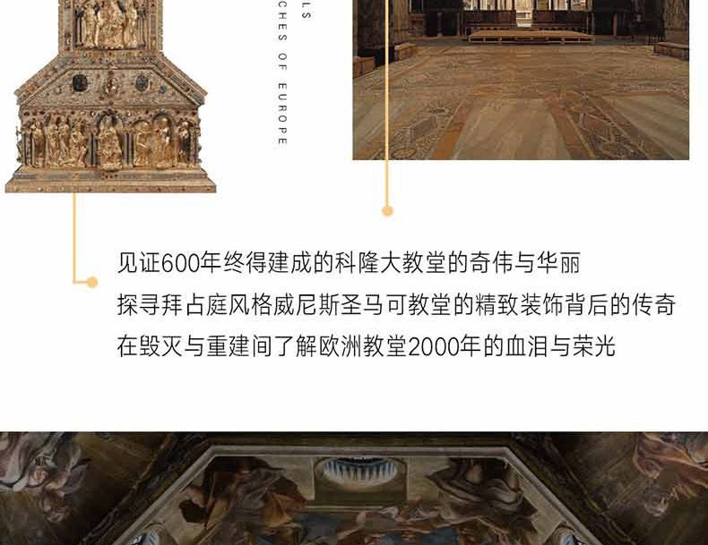 2019年,巴黎圣母院因火災而損毀嚴重,你會因為還沒來得及了解、欣賞它而感到遺憾嗎?在歐洲,有非常多歷史悠久、壯觀唯美的教堂建築。你也許會震撼於科隆大教堂盛期哥特式建築的宏偉與華麗, 讚歎威尼斯聖馬可教堂拜占庭風格的精緻裝飾, 或者一直想去參觀巴塞羅那建築怪才高迪的世紀經典之作……其實,它們大都不斷被損毀又重建,在時光的洗禮中飽經風霜,歷史悠久卻又脆弱易逝。這些神聖的建築藝術遺跡值得我們珍惜以待。