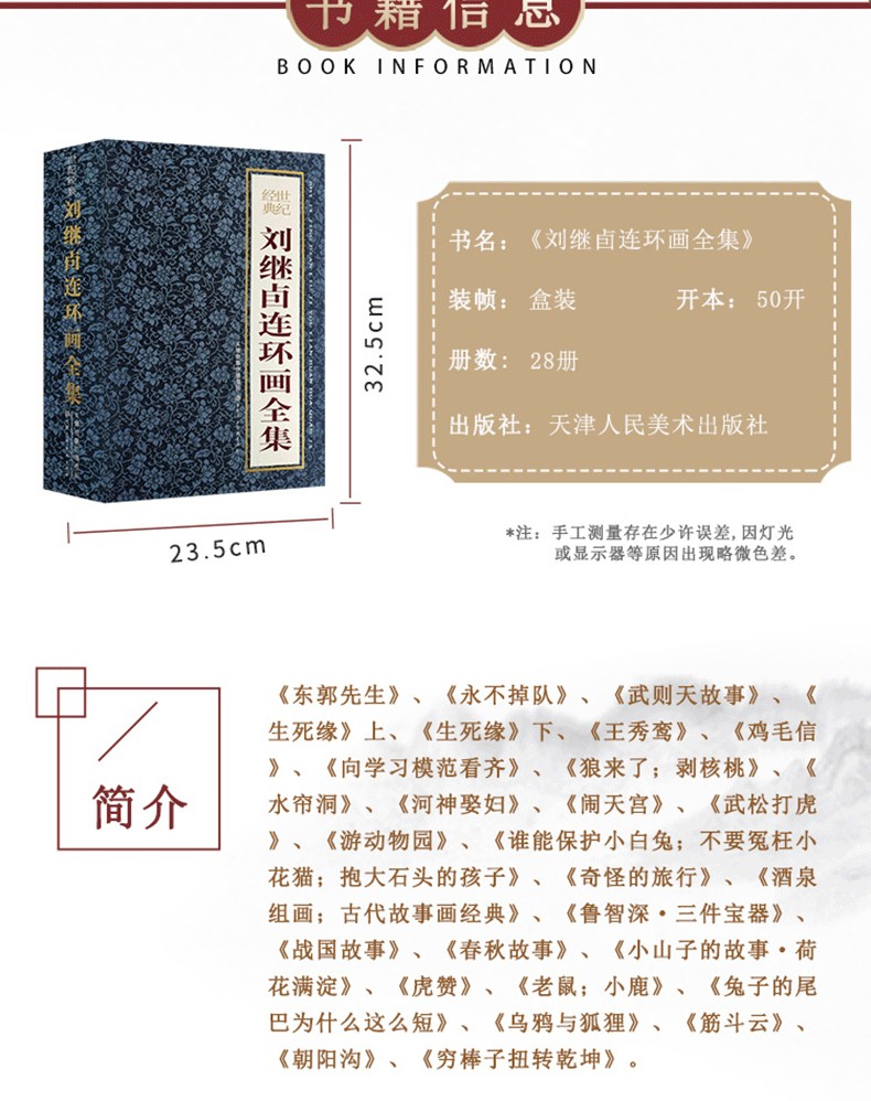 此全集,盡力收集了劉繼卣先生創作的各類連環圖畫23冊,故事性、連續性插圖畫5冊,共計28冊。合作繪畫的作品和署名不詳的作品(此類作品為數不多)未收入全集,在此一併說明,敬請諒解。