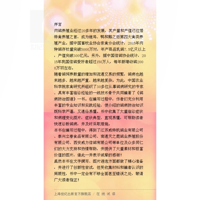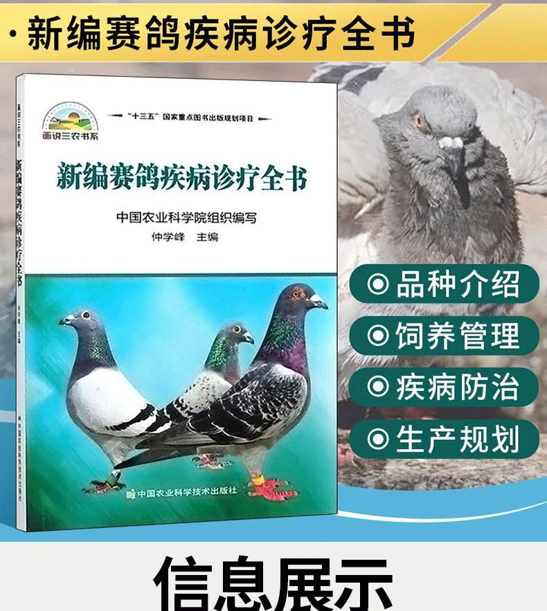 本書圖文並茂,文字簡潔扼要,圖片清晰、直觀 易懂,內容重點突出、實用性強,可供廣大養鴿者、 基層獸醫工作人員參考。