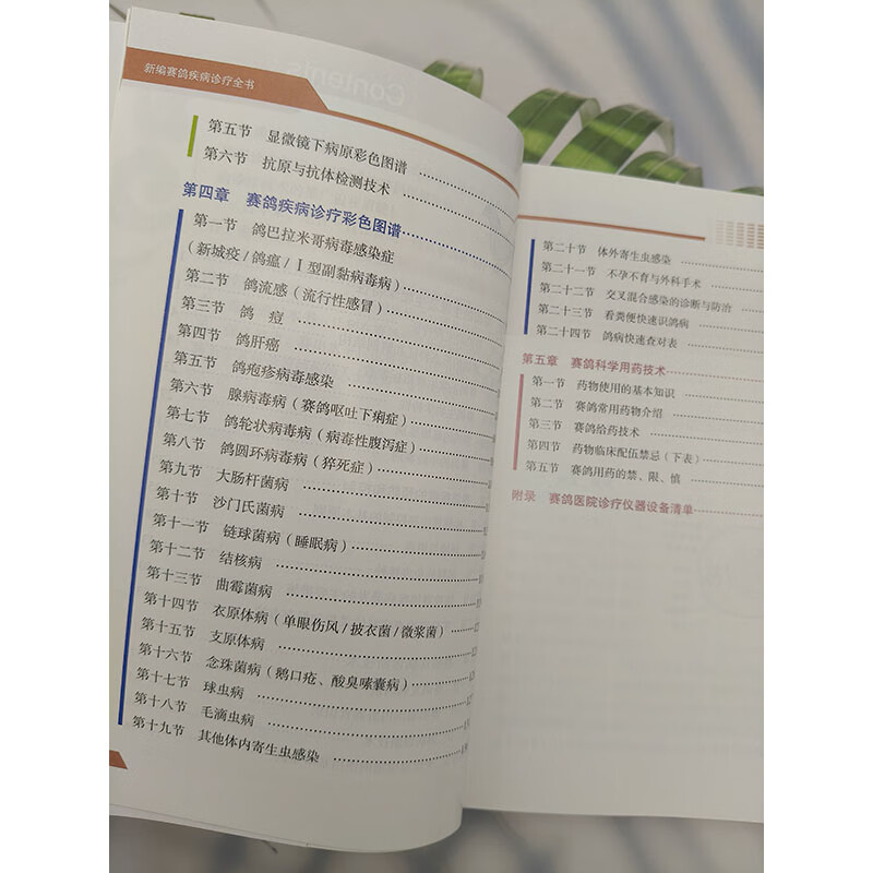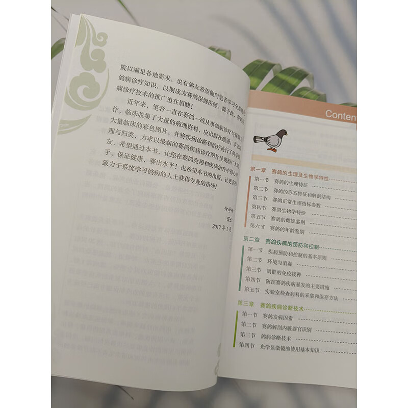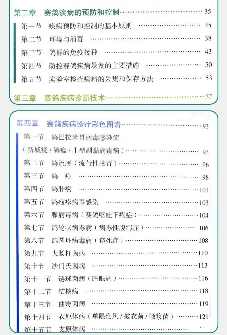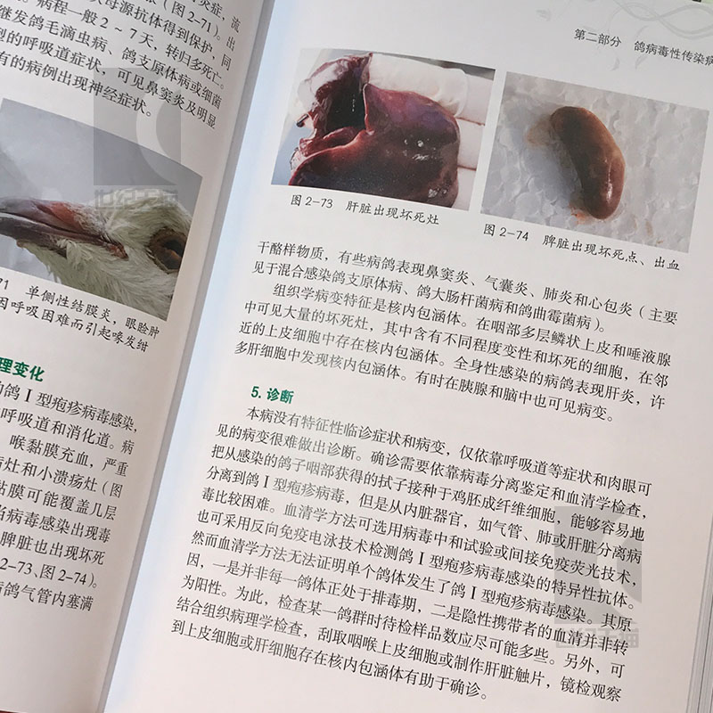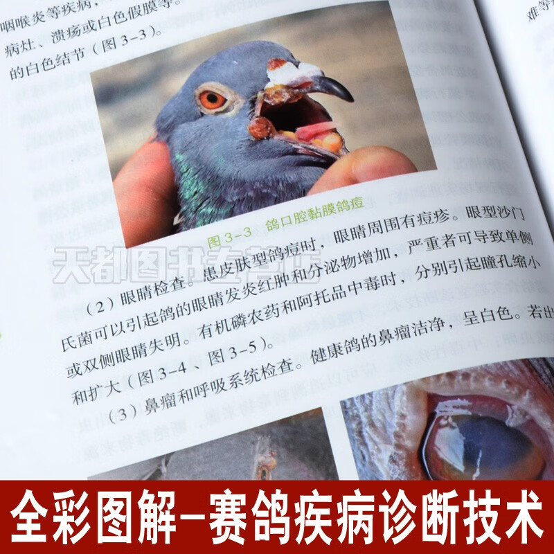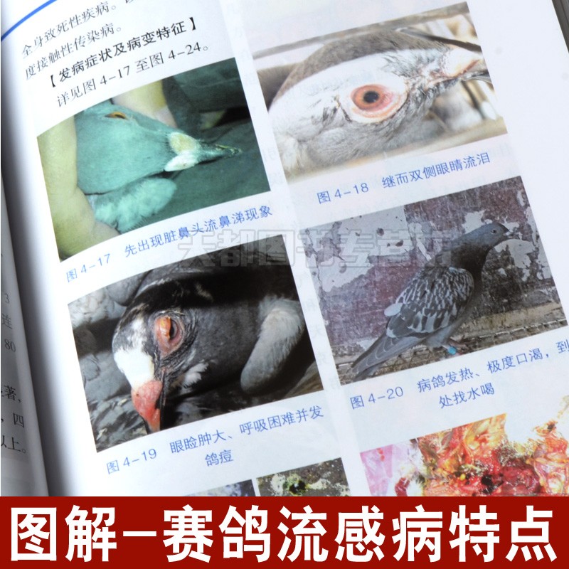 趙寶華、戴鼎震、楊一波主編的《鴿病防治圖譜(精)》內容包括鴿病綜合防治技術,鴿病毒性傳染病,鴿細菌、支原體、衣原體和真菌性傳染病,鴿寄生蟲病,鴿營養缺乏症與代謝疾病,鴿中毒性疾病,普通病及胚胎病,共六個部分。書中主要介紹了常見鴿 病的診斷和防治方法。在臨診症狀和病理變化部分配有大量典型圖片;在診斷部分除介紹常規診斷外,還有相似疾病的鑑別診斷,要點突出,有助於提高常見鴿病診斷的準確性,以便及時採取防治措施。