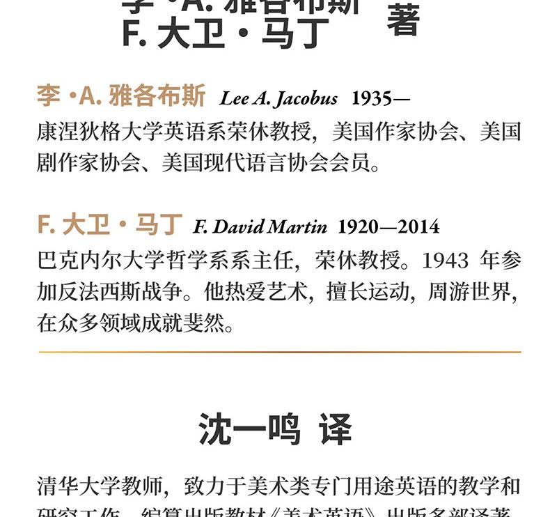 芝加哥大學哲學博士,巴克內爾大學哲學系系主任,榮休教授。 1943年參加反法西斯戰爭。 1947—1949年任教於芝加哥大學,1949年就職於巴克內爾大學哲學系。 1957—1959年獲富布賴特基金資助,赴佛羅倫斯及羅馬從事研究工作。 1980—1984年任職於賓州人文公共委員會。本書自1970年代出版後不斷再版,是F. 大衛馬丁在學術界影響力持久的一個有力證明。此外,他還著有《雕塑與活躍的空間》《面對死亡:主題與變奏》等,發表學術論文百餘篇,榮獲多項研究經費。藝術哲學、藝術的社會價值和對美學的培養是他在教學與研究中長期關注的重點。他熱愛藝術,尤其是雕塑、建築、繪畫和音樂,擅長網球、高爾夫球運動,週遊世界,在許多領域成就斐然。