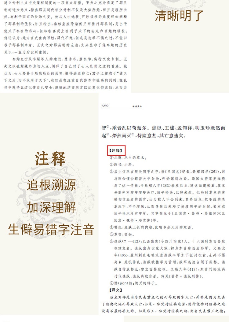 《讀通鑑論》是明末清初著名思想家、史學家王夫之的一部史論名著,以司馬光《資治通鑑》所載史實為據,系統地評論自秦至五代的封建社會歷史,分析歷代成敗興亡,盛衰得失,臧否人物,引古鑑今,探求歷史發展進化規律。全書議論縱橫,新見迭出,堪稱傳統史論中最系統最精彩的傑作,同時全面反映了王夫之的歷史觀和政治思想傾向。