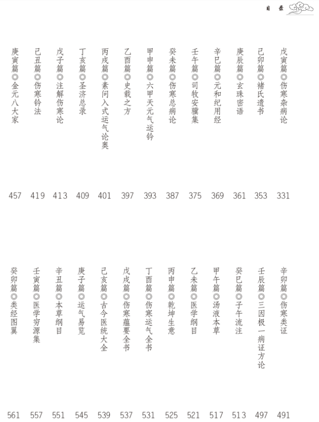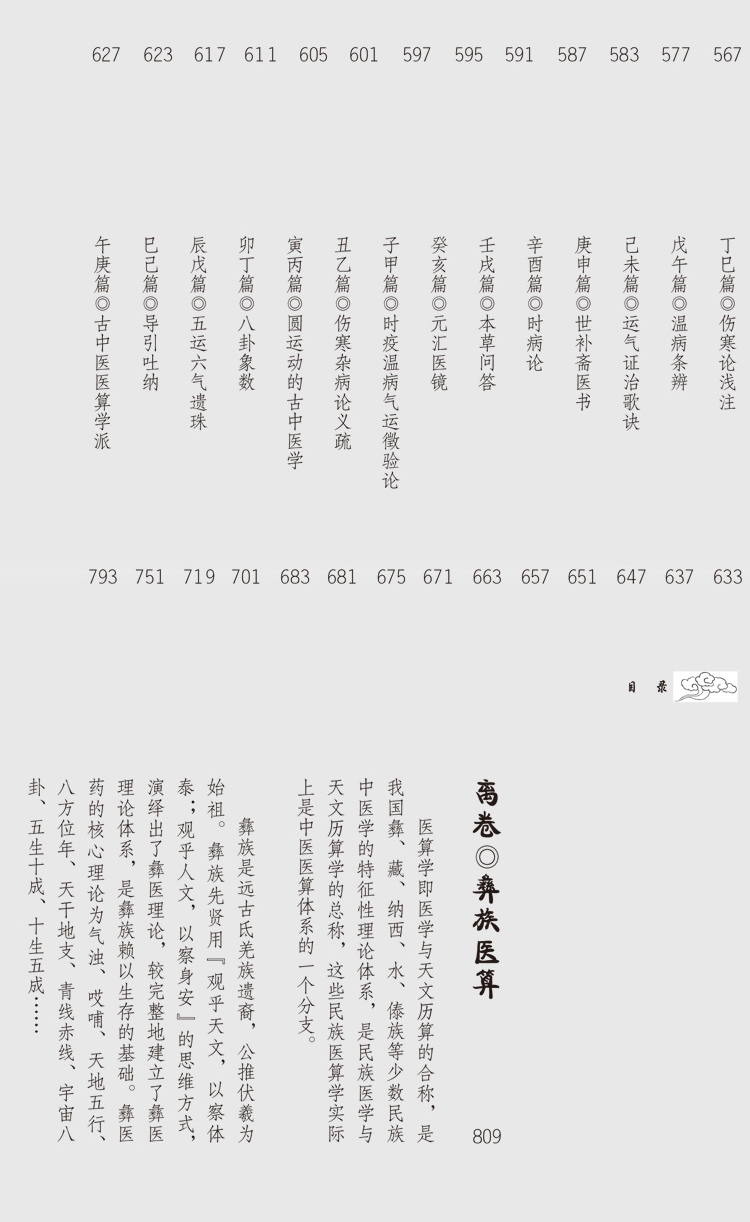 此書目錄僅分卷篇兩級,以八卦五行、北斗干支分列,乾坤兩卷開路,述中醫源流;《坎卷》厚重,其中分篇皆以乾支命名,為全書數術之重心;《離卷》及以後部分列述少數民族及外國醫算,異曲同工,權作參考。