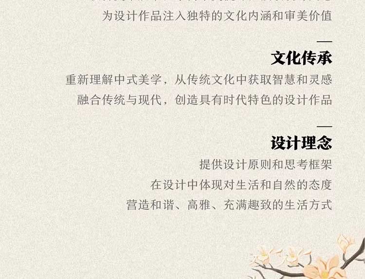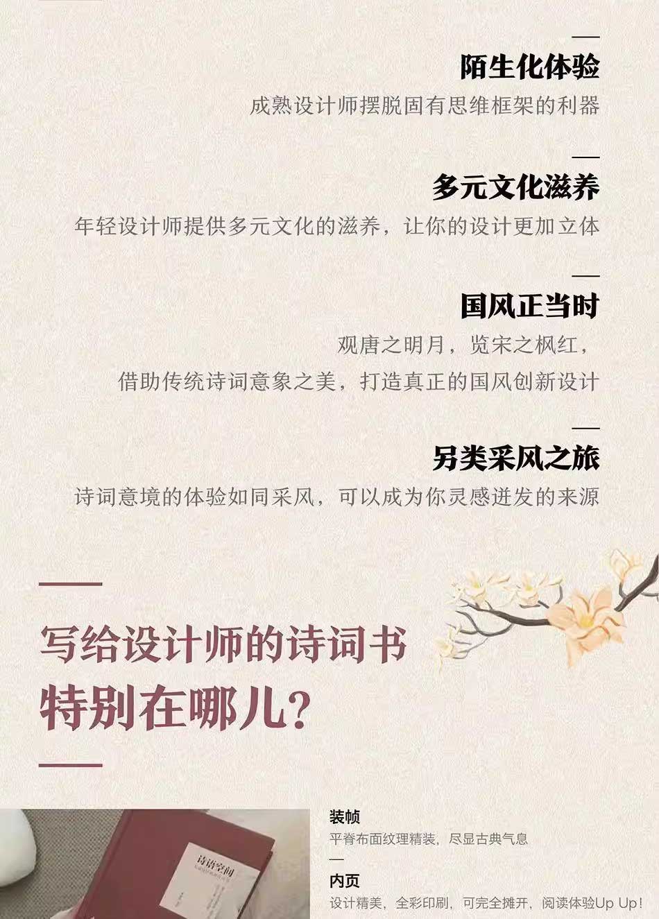 結合中國傳統藝術理論,幫助設計師確立對中國詩詞空間之美構成要素的認知1. 設計師需要不斷的刺激和觸發,因此觸類旁通的體驗非常重要。詩詞意境的體驗對於設計師來說如同外出采風,可以給予設計師瞬間情感迸發的來源;2. 唐之明月,宋之楓紅。詩人看過的煙雲物色與今天設計師看到的有著“不同之同”,作者便是通過解讀詩詞幫助設計師去理解這種“同”;3. 為年輕設計師提供多元文化的滋養,使其設計倆年更加豐富、立體;4. 詩詞作為與設計不同的藝術種類,為成熟設計師提供了“陌生化體驗”,幫助其擺脫固有思路和框架。