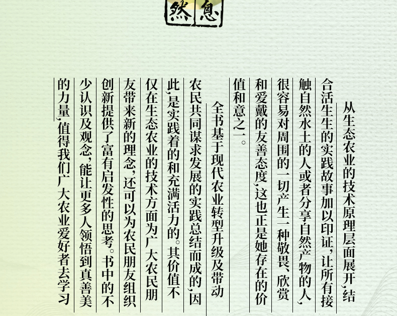 本書主要講述作者在湖北宜昌從事自然農業,創辦農業專業合作社,以及後來從事農業諮詢的工作經歷,如何實踐自然農法進而形成一定的理論體系,集在全國範圍內推廣自然農法的經驗寫成全息自然農法的原則,自然農園設計要素與案例,作者經營自然農業多年後的感悟(包括經營、管理農業合作社的心態,要點等)。