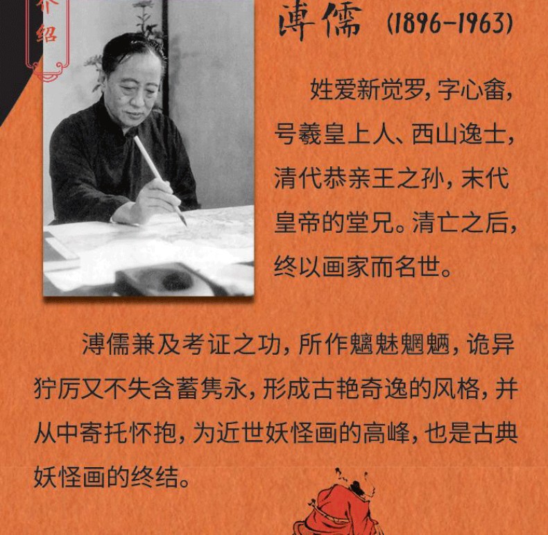 溥儒畫作題材甚廣,山水人物、花鳥走獸無一不精,晚年喜作妖怪畫,取材自《山海經》《搜神記》《酉陽雜俎》《太平廣記》《西遊記》《聊齋志異》《子不語》等經典。溥儒兼及考證之功,所作魑魅魍魎,詭異獰厲又不失含蓄雋永,形成古艷奇逸的風格,並從中寄託懷抱,為近世妖怪畫的高峰,也是古典妖怪畫的終結。