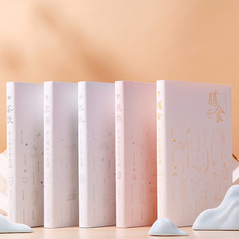 這套書就是《古人的日常生活》(全五冊),它包含「服飾」、「膳食」、「家居」、「茶飲」和「把玩」五個具體生活領域。 幾乎囊括了人們日常生活中基本衣食住娛的方方面面,如一套「古人日常生活百科全書」。 比起較為普遍的宏觀描述,這種貼近一般人視角的內容,更會讓人眼前一亮。