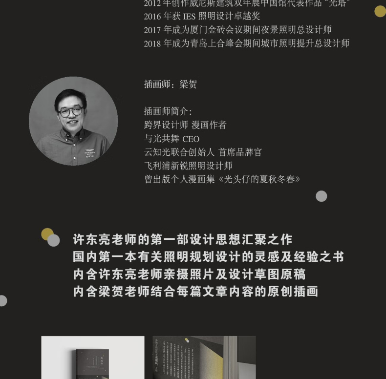 無論你是新手照明設計師還是在穩定提升階段的照明設計成手,書中分享的35篇文章會如35計實用的照明設計“兵法”,為你指明未來的方向。此外,每篇結尾都配上插畫家幽默又耐人回味的原創插畫, 在閱讀酣暢淋漓之時,又增添些許獨到玩味。