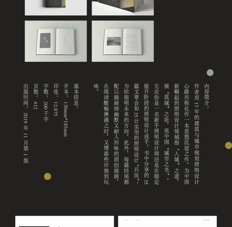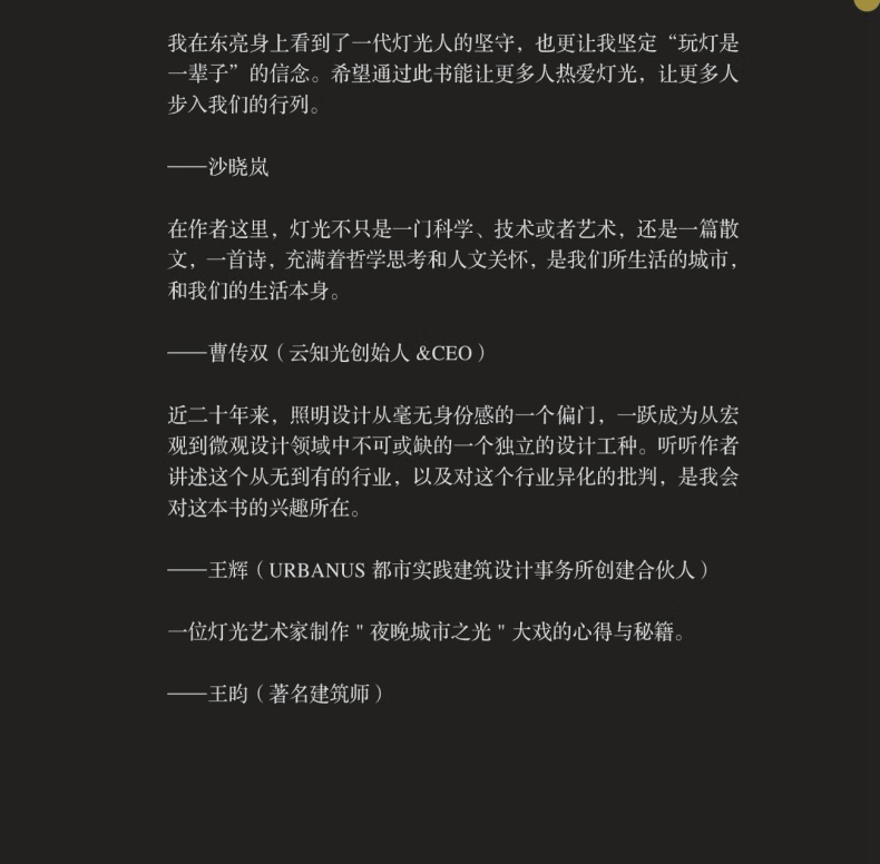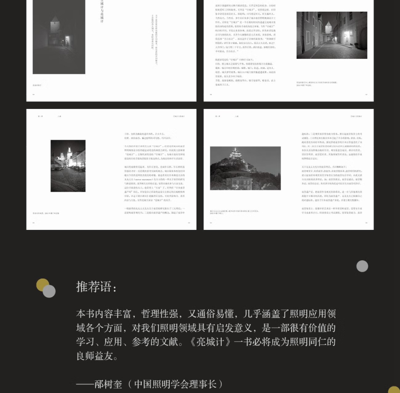 全書以功能各異的照明項目設計實踐為基礎,將每個項目的設計背景、構思及實踐心得,打磨成一條設計啟示,二十餘個項目,二十餘條設計啟示直指國內照明設計師都會面對的設計痛點,以解答照明設計的實踐困惑。