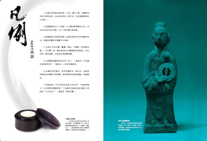 為充分展現中國古代海上交通和航海技術的發展,本項目不僅有豐富的古航海圖、古書影圖,還在全書的前言、每篇的篇首語之中配置了精彩的圖片。這些圖片有出土的文物,如新石器時代的木漿、西漢的獨木舟、東漢廣州陶船模型、南宋持羅盤陶俑、南宋量天尺、南海1號沉船上的古陶瓷和金戒指、鐵鍋子等金屬物件,有北宋浮水磁針模型、帆船模型、鄭和船隊模型,還有記錄鄭和下西洋的天妃靈應之記碑、鄭和行香碑,以及引導航海的廣州港航標-懷聖寺光塔、泉州港航標塔-六勝塔,記錄海上交通的大事件徐福東渡、康泰南交、法顯取經、義淨西航、鑑真赴日、圓仁入唐、奉使高麗、汪大淵航海、謝清高漫遊的雕塑、書畫等,由設計師設計成獨特的畫面。