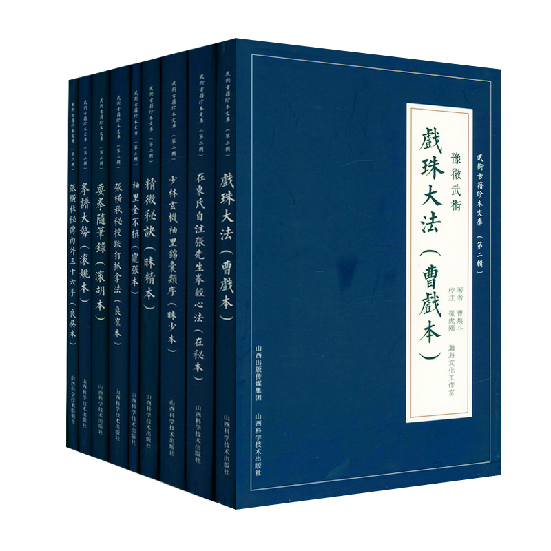 本套書是從河南少林寺玄機和尚拳譜傳係當中精選出來的九個版本,歸屬於「豫徽武學」。 《袖里金不換》修正了唐豪關於張三昧的誤判;《精微秘訣》明確記載了張鳴鴞與張孔昭的關係;《拳譜大勢》為考證戚繼光記載的短打與短打的關係提供了關鍵文獻;《戲譜大勢》為考證戚繼光記載的短打與短打的關係提供了關鍵文獻;《戲珠大法》是玄機和尚八大傳系中曹系的重要代表作;《張橫秋秘授跌打抓拿法》為澄清曹煥鬥著作出處提供有力證據;《張橫秋秘傳內外三十六手》記載了張橫秋實戰秘傳拳譜;《要拳隨筆錄》記載了張橫秋傳授綿張的事蹟;等等。