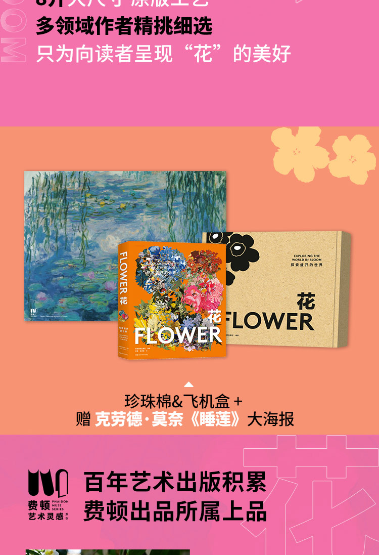 《花:探索盛開的世界》帶領讀者踏上跨越各個大洲、穿越各種文化的旅程,探索從古埃及至今的約4000年間,人類歷史上藝術家和圖像製作者們對花卉圖案取之不竭的利用。這項引人入勝的調查收集了316幅華美的圖像,涵蓋了多樣的風格和媒介——從靜物畫和植物插圖到雕塑,從時裝作品到插花藝術。