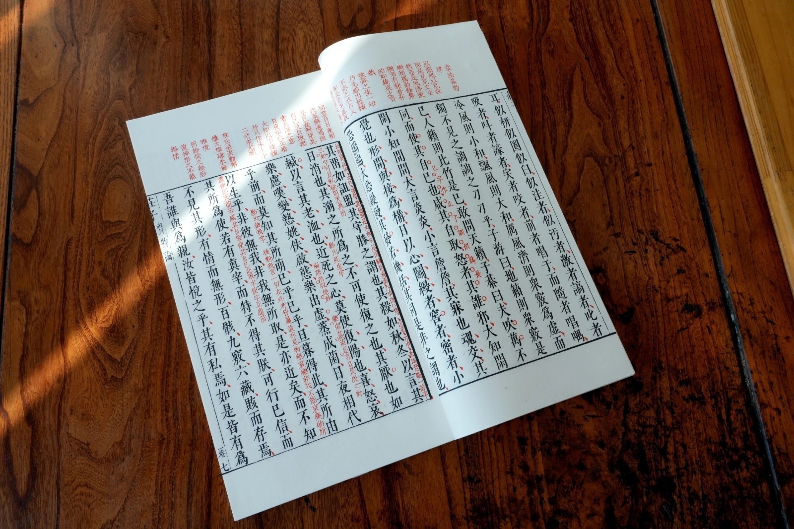 明閔齊伋,字及武,號遇五,烏程(今浙江湖州)人。曾入國子監,家富資財,不求功名,唯好藏書、編書、刻書。首創書籍套印技術。所刻書以實用為主,包含經、史、子、集以及小說、戲曲,多為套色印本,與凌濛初刻本齊名。 《莊子南華真經》是閔齊伋所刻子部類《三子合刊》之一,選錄明代著名學者孫鑛的評點,對《莊子》一書字句、章節的藝術特色、寫作技巧作了精彩點評,可以讓我們從文學角度來欣賞這部千古奇書,並學習其特色文法。本書原為朱墨套印,正文為黑色,斷句、批點為紅色,悅人眼目,堪稱書中的藝術品,可藏可讀可賞。本書據上海圖書館藏明末閔齊伋輯《三子合刊》本套色影印。