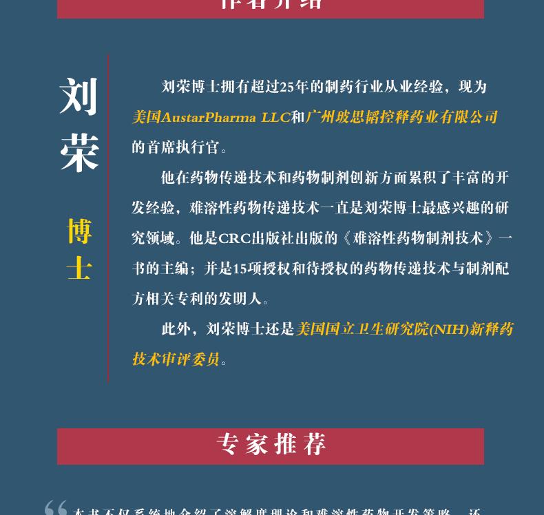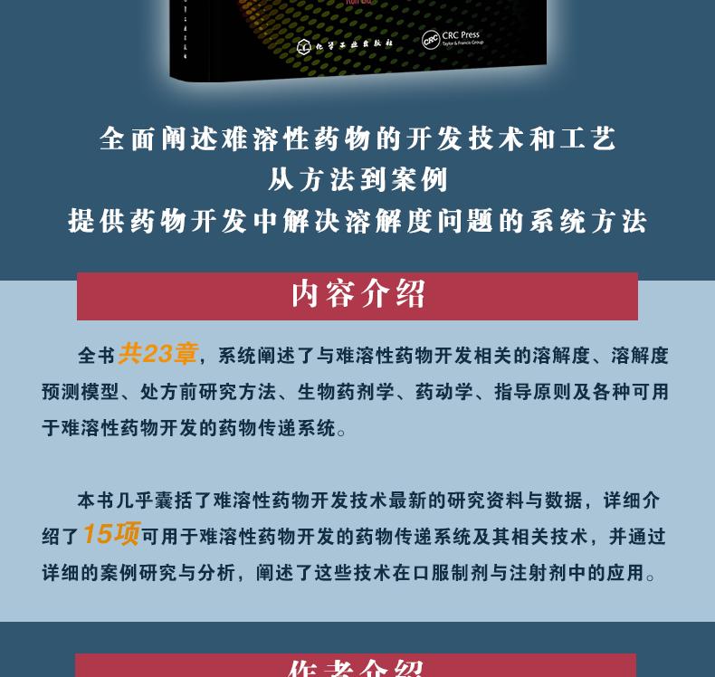 本書原著為第三版,是一部經典的藥物製劑參考書。本書全面闡述了難溶性藥物的開發技術與工藝,為難溶性藥物開發過程中,藥物溶解度問題的解決,提供循序漸進的科學方法。全書共23章,系統性闡述了與難溶性藥物開發相關的溶解度、溶解度預測模型、處方前研究方法、生物藥劑學、藥動學、指導原則及各種可用於難溶性藥物開發的藥物傳遞系統。本書幾乎囊括了難溶性藥物開發技術近期新的研究資料與數據,詳細介紹了15項可用於難溶性藥物開發的藥物傳遞系統及其相關技術,並透過詳細的案例研究與分析,闡述了這些技術在口服製劑與注射劑的應用。本書適用於新藥製劑研究開發人員,也可供相關院校大學師生參考。