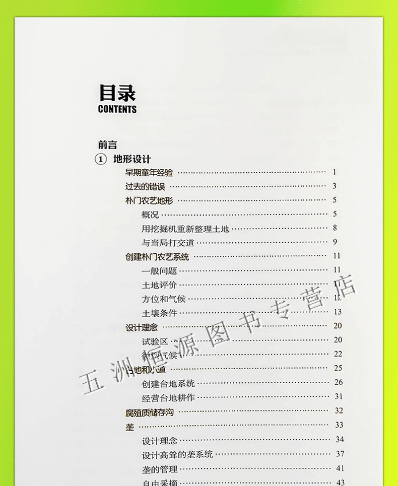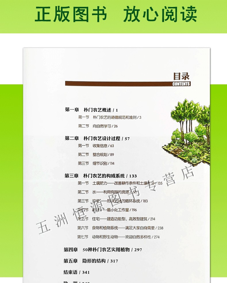 《實用樸門農藝》第一章內容是樸門農藝概述,向大家介紹樸門農藝的基礎知識,包括樸門農藝的內涵和朴門農藝背後蘊含的道德準則。另外,這一部分還介紹了基本的地球科學知識,為下一階段的設計規劃做鋪墊。第二章為大家講述了完整的樸門農藝設計流程,首先是觀察分析評估,其次是製定總的規劃綱領,然後是完善實施細節,*後是維護修繕方案。第三章詳述了樸門農藝的構成系統以及如何管理這些系統,包括:土壤肥力、水、垃圾、能源、住宅、食物生產、動物和野生動物。第四章列舉了50種樸門農藝實用植物。第五章介紹了樸門農藝設計的隱含要素,也就是那些支撐樸門農藝設計的經濟學和社會學理論。