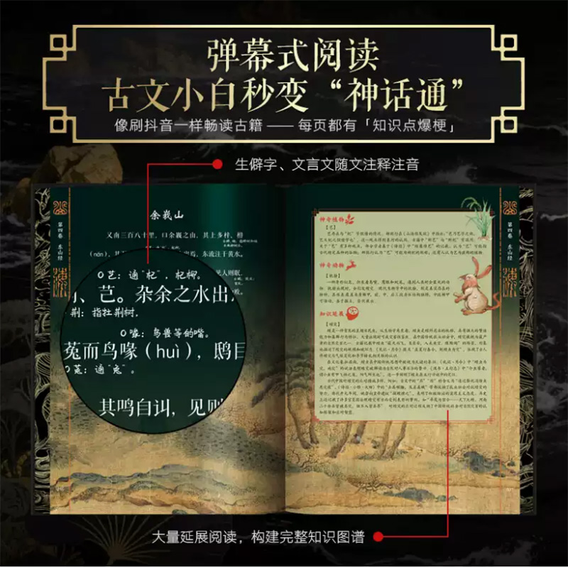 4.一本將知識點全打通的《山海經》:獨家整理70+珍稀物產、22處古今地理對照、21個專有名詞釋義、7個經典神話故事,還融合15幅中外古畫、6首古詩詞、6種中國傳統色等,並引入三星堆等文物考古成果進行文化溯源,將神話、歷史、地理、藝術、文學、考古全面串聯,構建出一張完整的“山海知識圖譜”,讓人越讀越上頭!