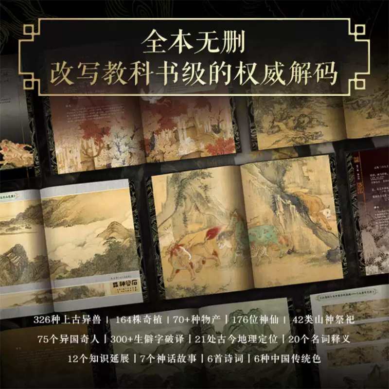 1.一套全篇目收錄完整的《山海經》:以最古老、最權威的版本宋代「池陽郡齋」本為底本,融合郝懿行《山海經箋疏》、郭璞、袁珂等六大學術版本校勘成果,糾正現存通行本中17處方位描述偏差,確保權威內容校勘成果,糾正現存通行本中17處方權。收錄18卷完整內容,通篇無刪減,涵蓋《山經》《海經》全貌,囊括327種上古獸、165種神奇植物、176位神靈仙人、42類山神祭祀、75個異國文明,系統呈現山海宇宙全貌!