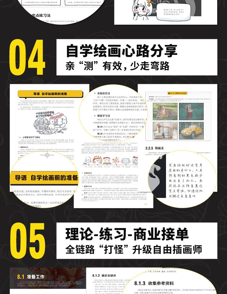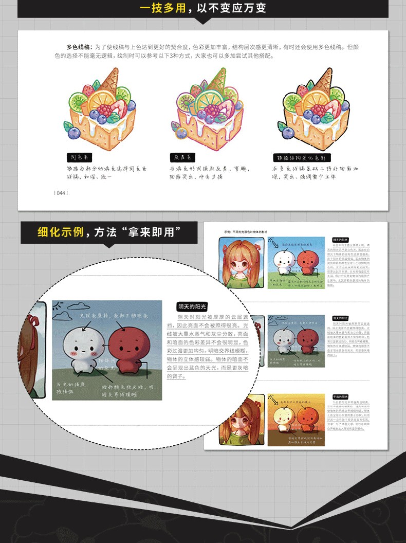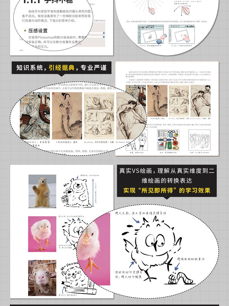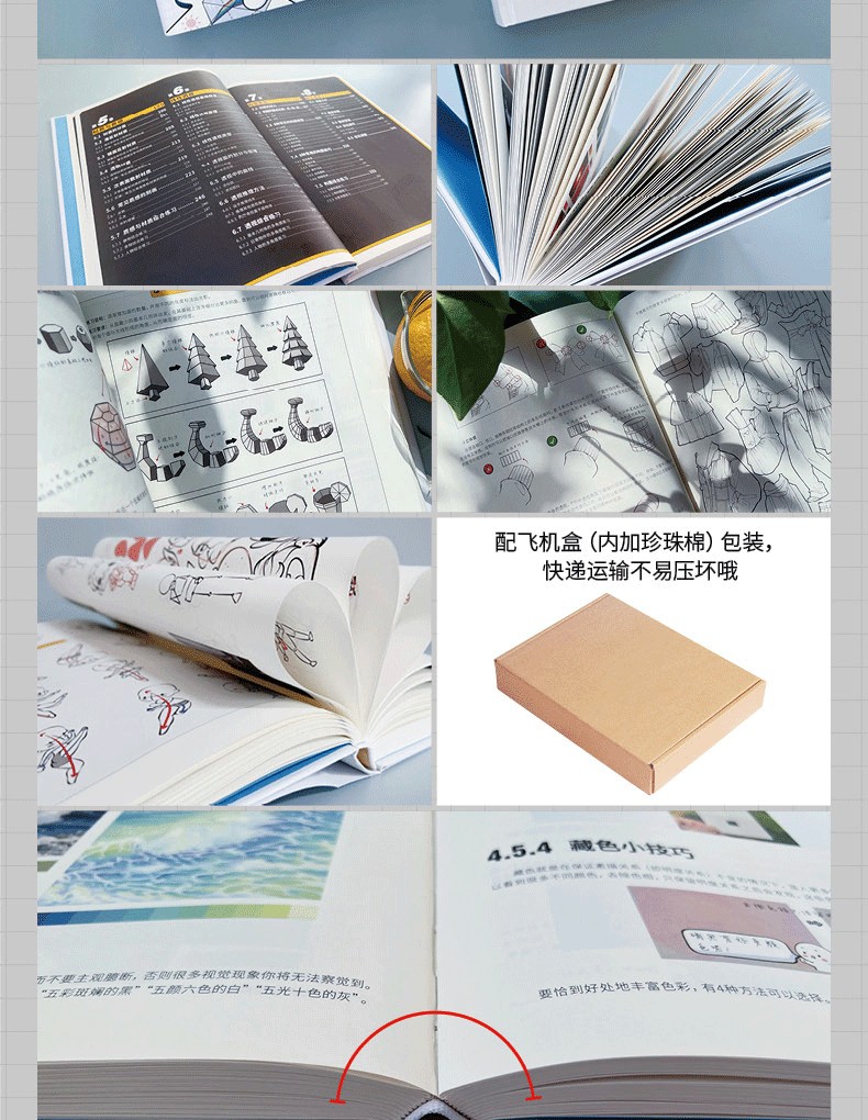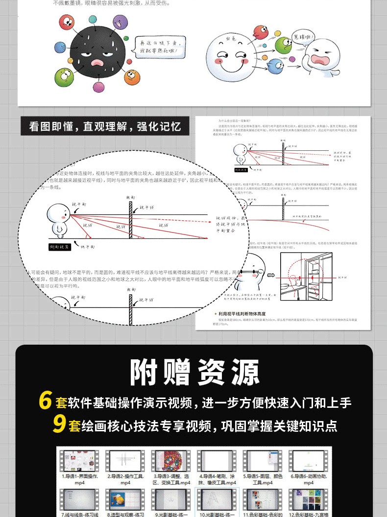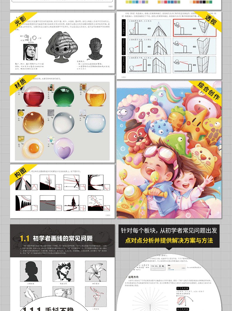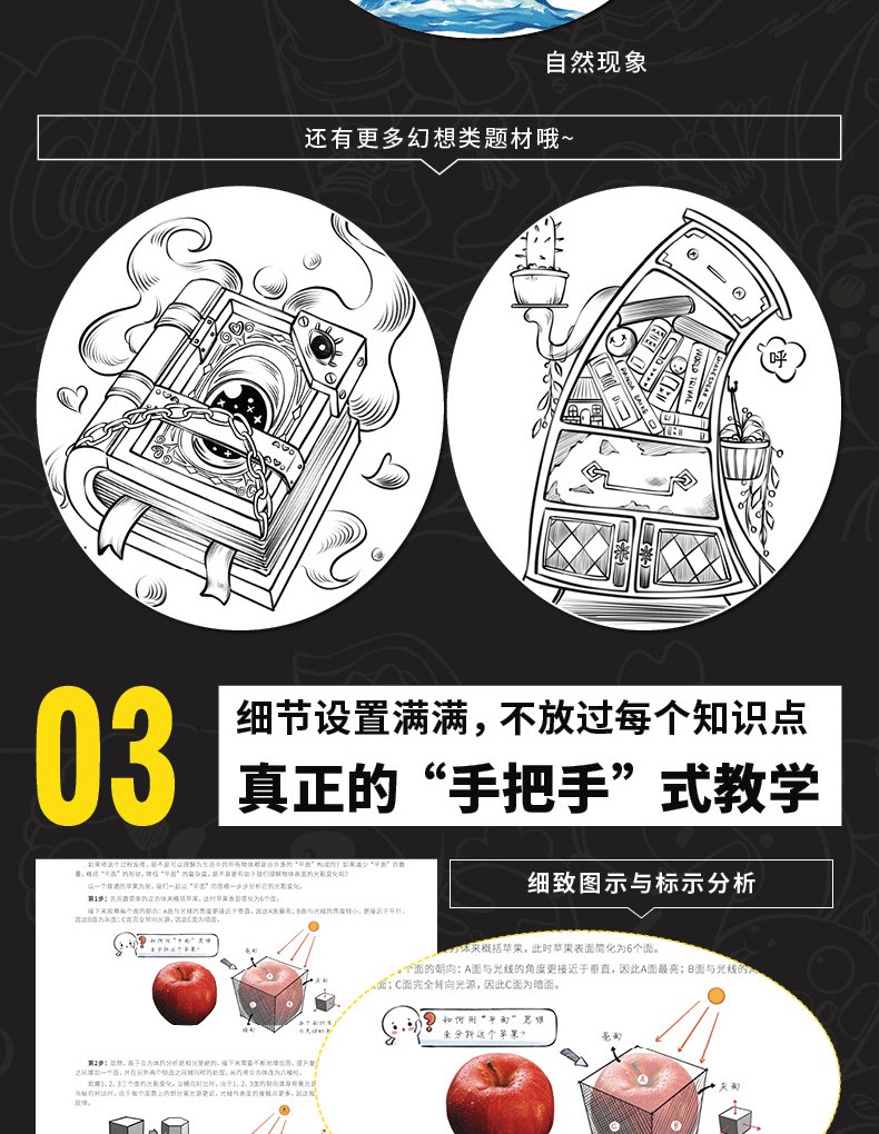 2.分主題講解,涵蓋線條、造型、光影、色彩、材質、透視、構圖、創作,每一部分詳細剖析,全指導跟練+專項自練