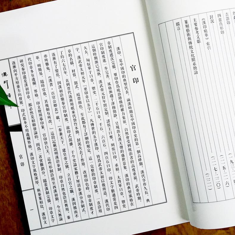 藝文類聚金石書畫館編著的《漢印三百品》收錄了漢印三百品,漢印佈局方正平直,無板滯、乖繆、纖巧的習氣,歷來為篆刻家所重。這本書以本社資深編輯為主要編纂力量,參考了各領域專家、學者的意見,針對工作特徵專門編寫。具有很高的藝術價值。漢印指漢至魏、晉時期的印章。文字的點畫比秦篆簡略、明快、熱烈,結構近於現代楷書,形體變秦篆的長形與漢隸的扁形,多呈方形。其中漢“將軍印”和“滿白文”,佈局方正平直,無板滯、乖繆、纖巧的習氣,歷來為篆刻家所重。