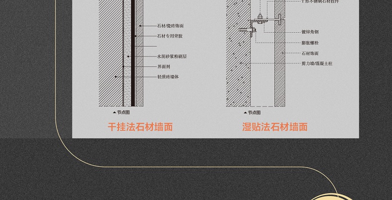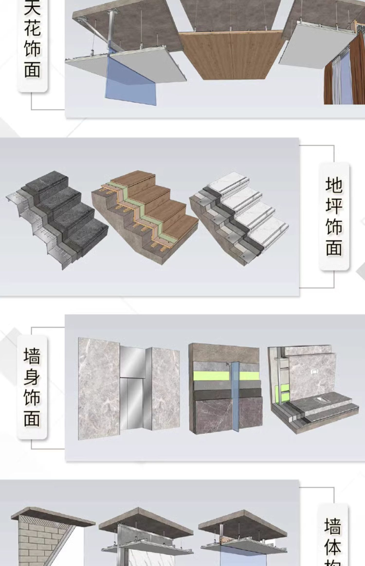 在深化設計中,節點是不可或缺的部分。雖然節點看起來是一個局部的內容,但實際上其提供的資訊十分豐富,可以說,最終的落地效果和施工品質很大程度上都依賴於節點圖。節點圖分為面層、中間層和底層三個部分,面層就是人肉眼可看到的裝飾材料;中間層則由骨架和填充材料組成,規定了一些施工材料的安裝厚度;底層即經過打毛或其他處理的原建築結構。理解好這三層結構,節點就十分簡單了。