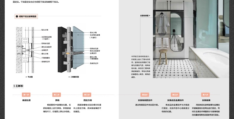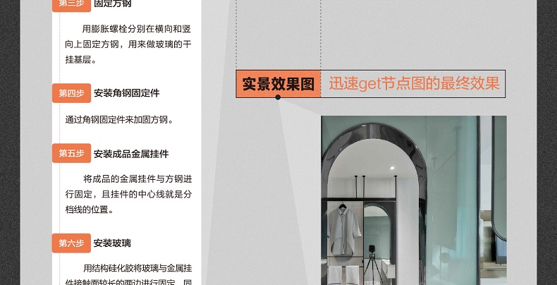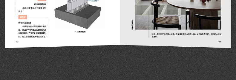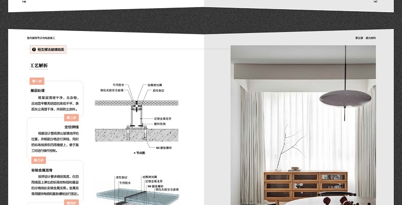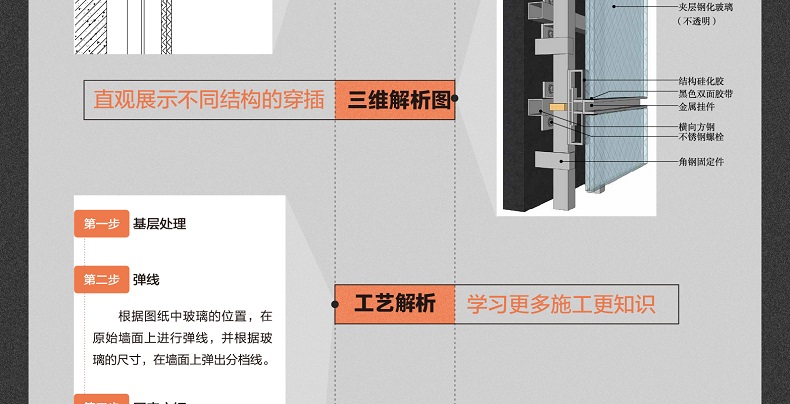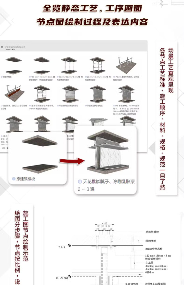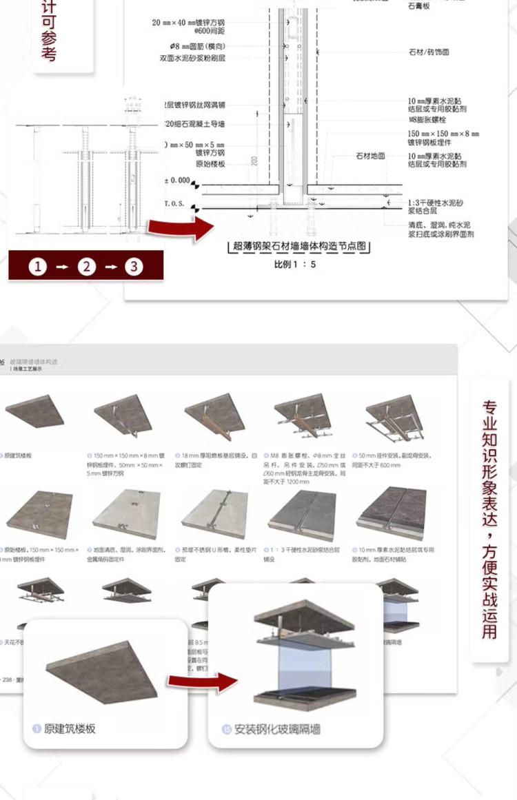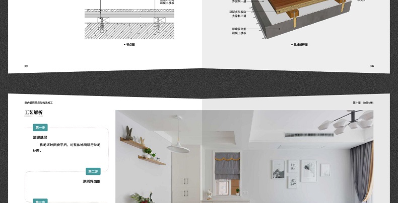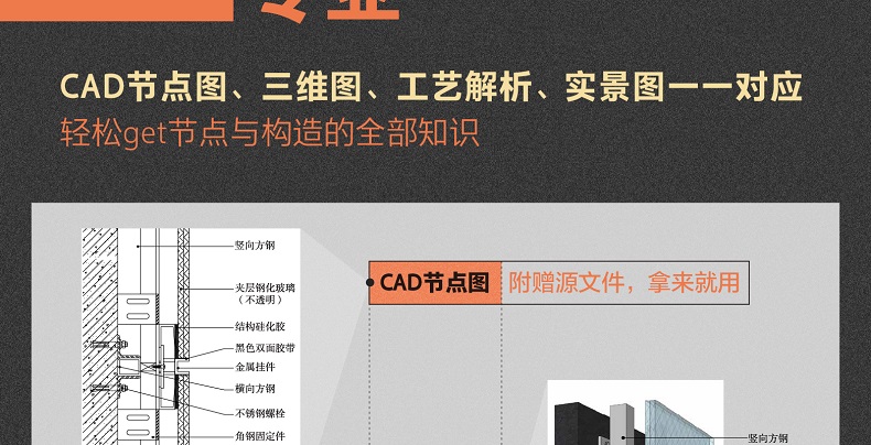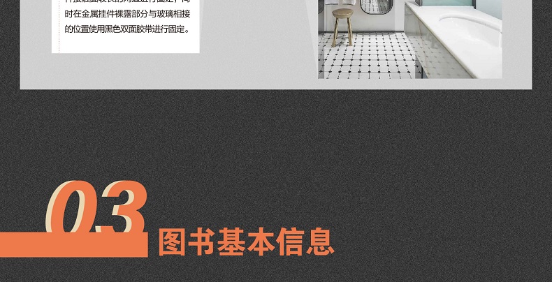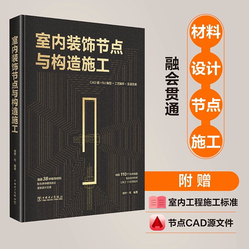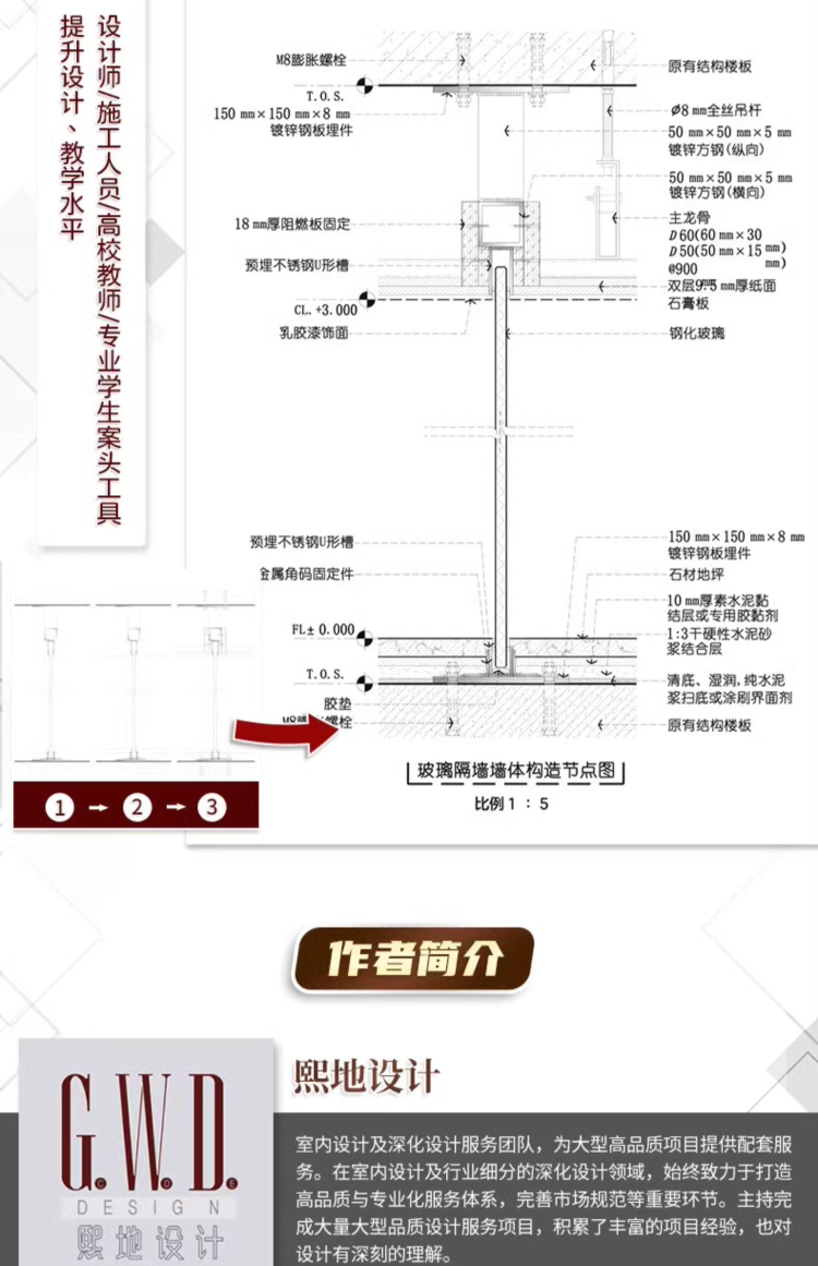 本書先透過講解材料,再講解裝飾形式,最後細化節點構造的方式,幫助讀者理解節點構造與施工工藝。簡單明了地分析材料的特性和分類,可以幫助讀者更快速地了解材料的使用位置。例如,不同位置的玻璃施工做法不同,而且整面玻璃和局部玻璃的施工做法也不同,透過不同的裝飾形式,讀者可以了解到不同結構所需的節點構造,遇到特殊結構時也能夠舉一反三,輕鬆畫出節點圖。關於節點構造,本書透過CAD 節點圖、三維解析圖以及製程解析進行講解,三維解析圖將製程視覺化,展示隱藏的施工結構,然後轉換成二維的影像,就是常說的CAD 節點圖,最後還輔以實景效果圖,幫助讀者了解裝飾效果和適用場景,為讀者在選擇製程時提供一定的參考。除此之外,還針對材料的不同裝飾形式做了詳細的工藝解析,像單一材料的裝飾就深入解析了通用工藝,而不同材料的相接或特殊位置則是進行了針對性的要點解析。