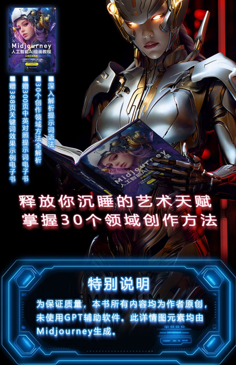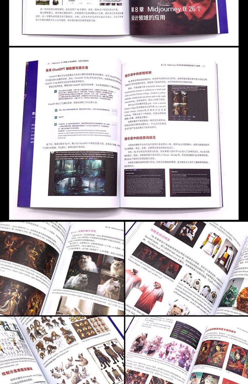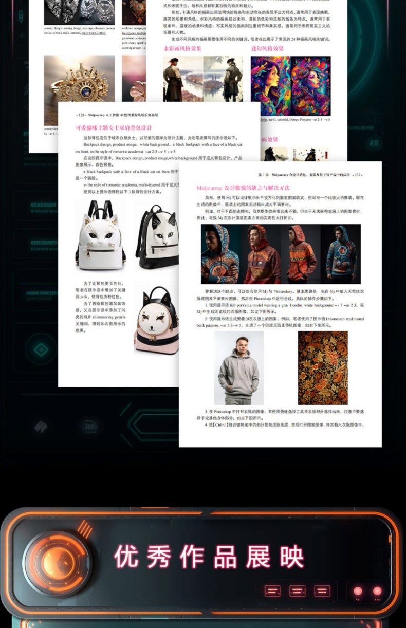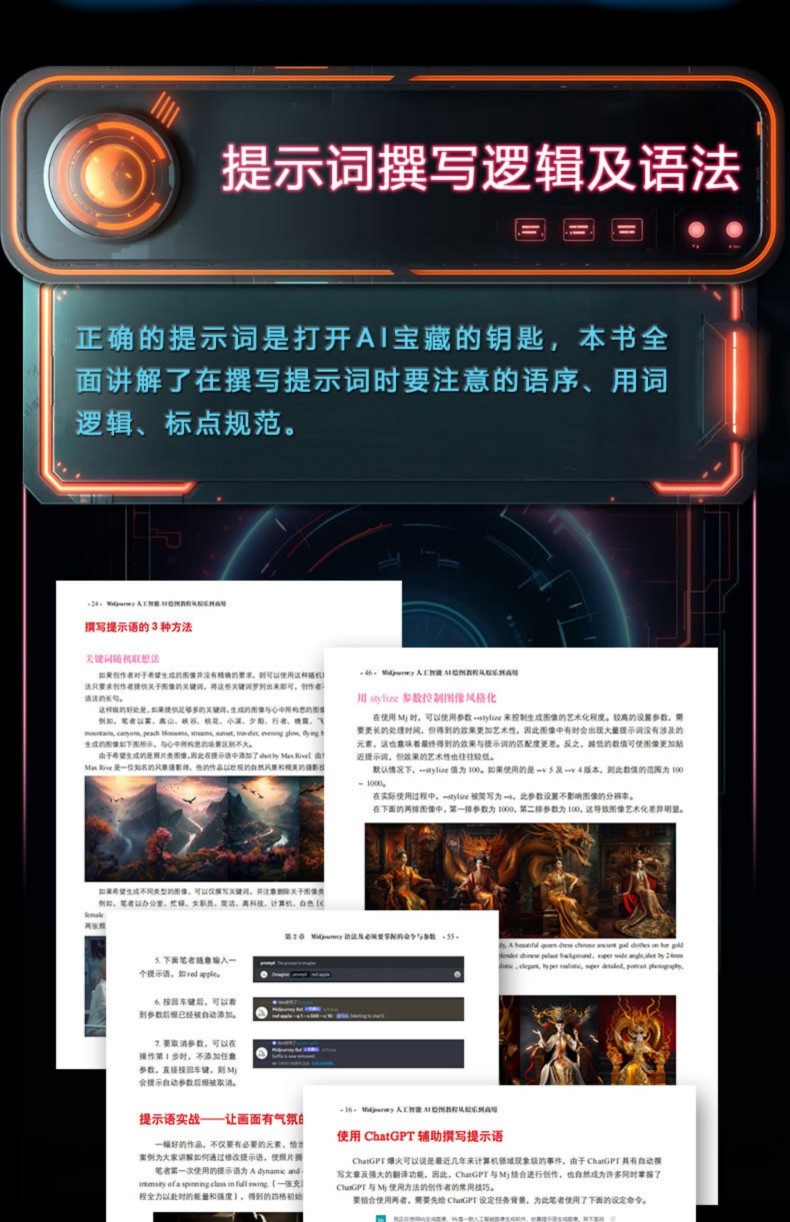 書中圖像全部由Midjourney渲染生成,效果圖配有提示語,也是軟件用戶最關心的“配方”,並在關鍵字下方有強調功能的下劃線,以確保讀者在使用此關鍵字時能夠得到類似的效果。