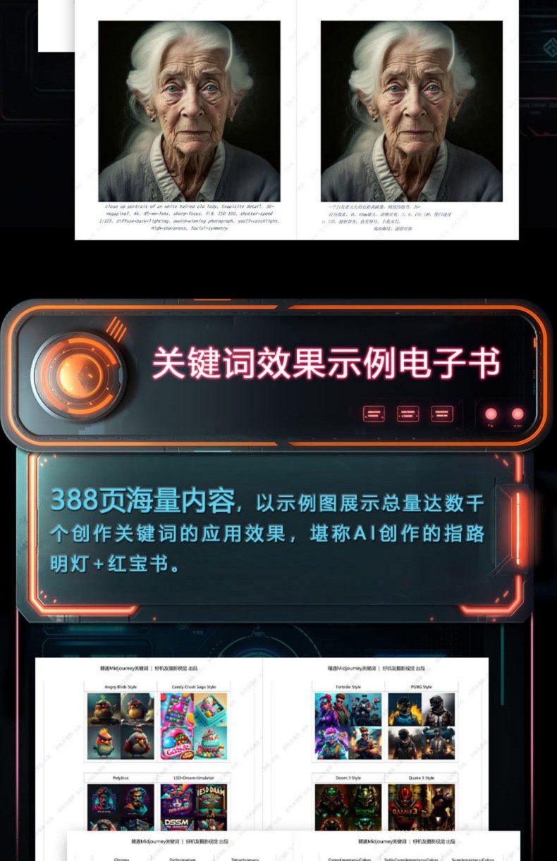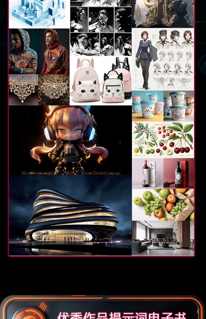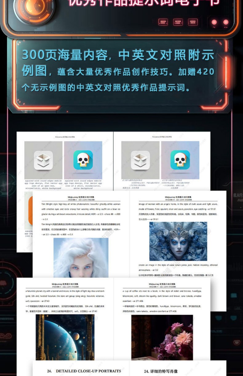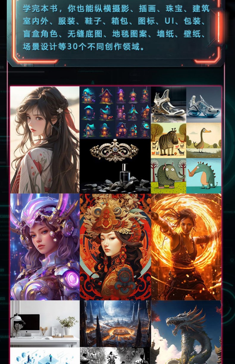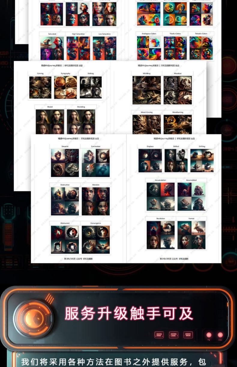 書中圖像全部由Midjourney渲染生成,效果圖配有提示語,也是軟件用戶最關心的“配方”,並在關鍵字下方有強調功能的下劃線,以確保讀者在使用此關鍵字時能夠得到類似的效果。