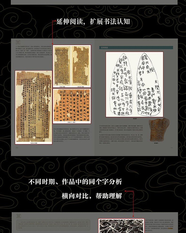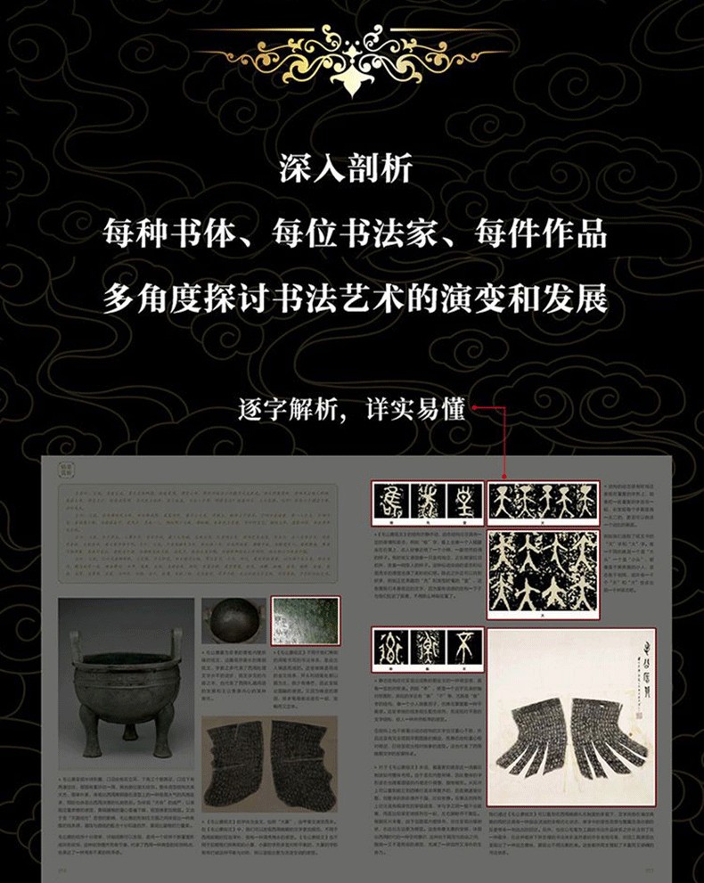 其中,書法的不同形式,涉及甲骨文、碑貼、書法、書畫題跋等,透過圖解形式,配以精準的闡釋,解讀百餘幅的書法史經典,圖文資料獨到經典,簡約深刻,論述通俗而專業,適合讀者輕鬆入手,亦可細品深讀,深切感受中國書法藝術的無窮魅力。
